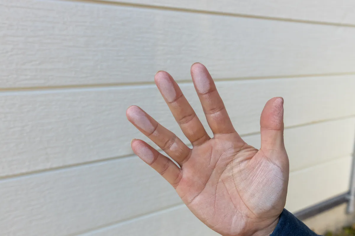 手に白い粉が付く状態。防水効果が低下しており、1年以内の塗装が必要です。